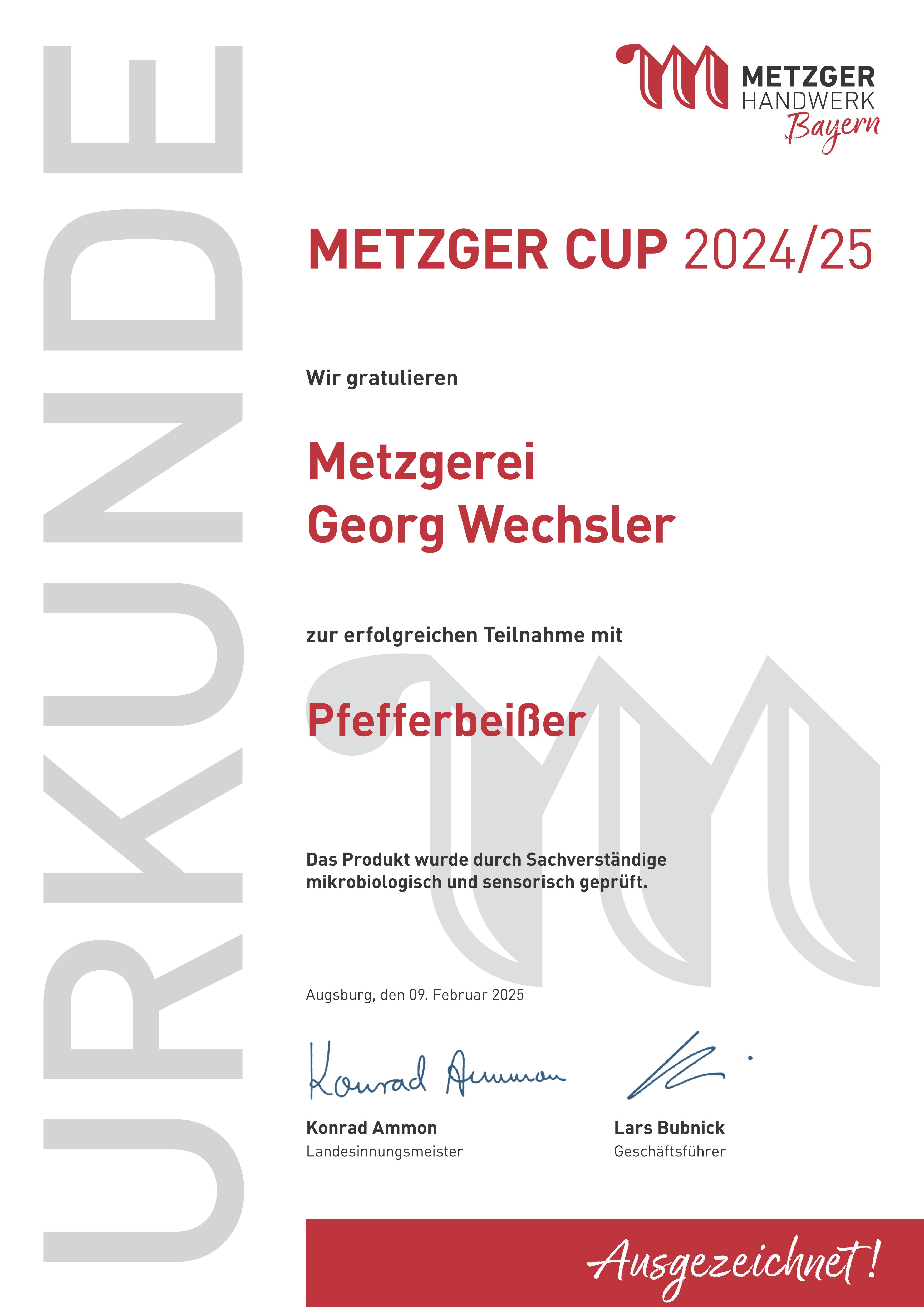 Sie sind auf der Suche nach einem originellen und exquisiten Geschenk? Versuchen Sie die Spalter Pilswurst der Metzgerei Georg Wechsler. Sie entstand aus der Idee heraus, das Spalter Nr. 1 mit unserer Wurst zu vereinen. Sie ist eine Halbdauerware nach Art der Bierwurst, bestehend aus Schweinefleisch, Rindfleisch und eben des bekannten Spalter Nr. 1.